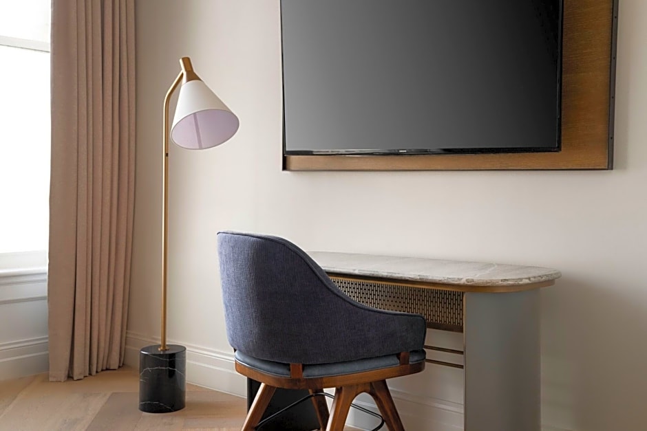 Featuring 18-foot ceilings, this room is located on the 5th floor and includes a marble bathroom with a walk-in shower or bath tub, bathrobe and hairdryer. Upscale bath amenities are also provided.